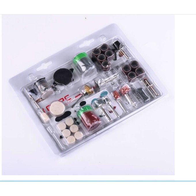 Bộ phụ kiện gồm 105 chi tiết lớn nhỏ. Là bộ phụ kiện hỗ trợ đắc lực cho các bác làm điêu khắc, làm lũa gỗ, khoan, khắc, mài các vật kích thước nhỏ, yêu cầu độ chính xác cực cao, trên các loại chất liệu: đá, kính, kim loại, nhựa, gỗ, phi kim…