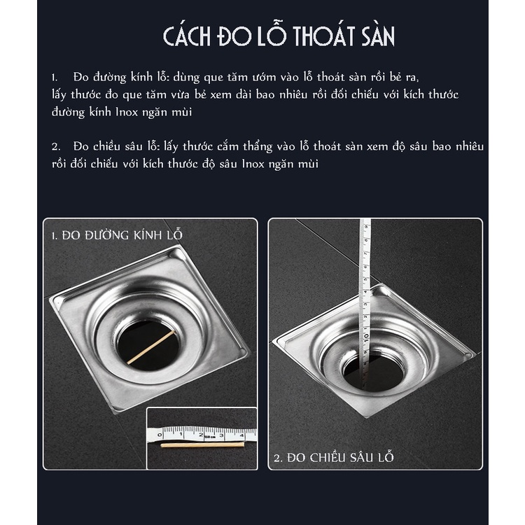 Trước tiên phải chọn mua bộ Ngăn mùi Inox 304 đúng kích cỡ thoát sàn ở nhà (kích thước nêu bên dưới) sau đó lắp như sau: