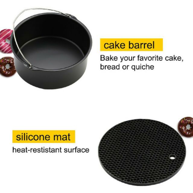 Chào các Anh (chị). Hiện nồi chiên không dầu đang là một sản phẩm không thể thiếu căn bếp mỗi gia đình.Shop hiện có thêm bộ phụ kiện để hỗ trợ dắc lực cho cả nhà nhé.Kích thước tối đa phụ kiện 20cm.❗1️⃣ Thùng nướng bánh: ngoài nướng bánh có thể tận dụng để làm các món hầm, soup luôn.