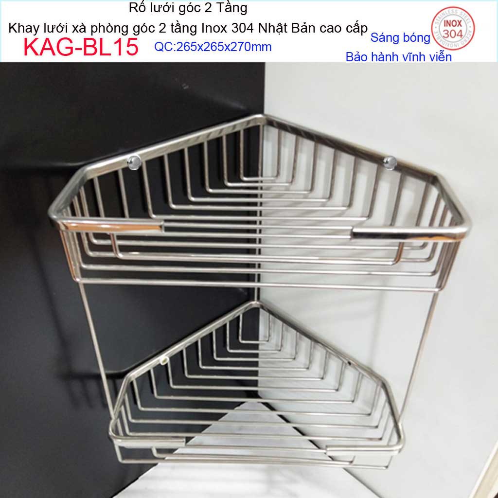 Kệ góc 2 tầng 265x265 mm KAG-BL15, kệ rổ xà phòng góc tam giác lớn SUS304 Nhật cao cấp inox đặc sáng bóng tuyệt đẹp