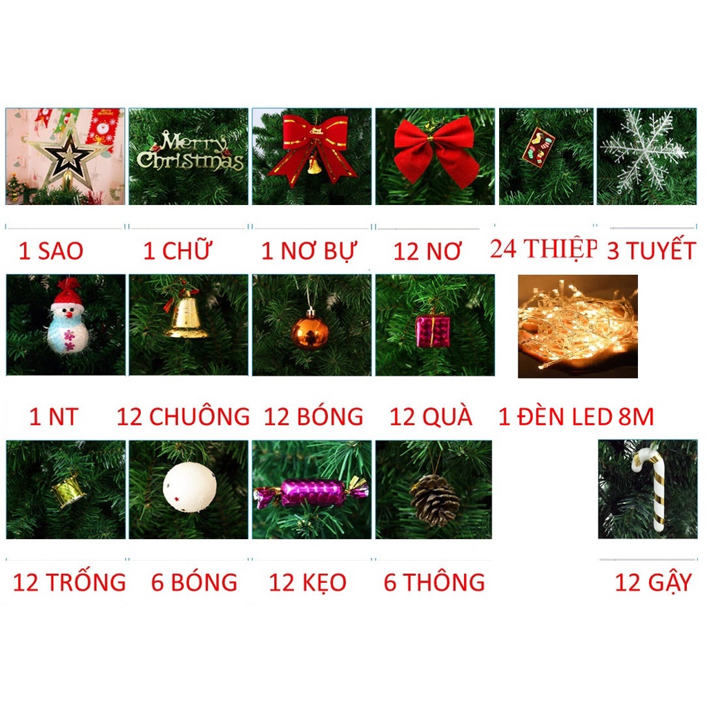 - Tương thích: Phù hợp lắp cho cây thông noel 90cm, cây thông 1m2, cây thông 1m5, cây thông noel 1m8.