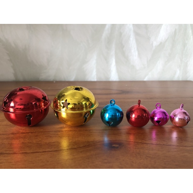 Phụ kiện trang trí Noel, chuông, lục lạc, nơ ruy băng nhiều mẫu.Chuông vàng cao 4cm, lục lạc to 4cm có 2 màu đỏ và vàng, lục lạc 3cm có màu đỏ, hồng, xanh, vàng, hồng đậm, trắng và lục lạc 2.5cm có màu đỏ, xanh, vàng, hồng đậm, trắng.