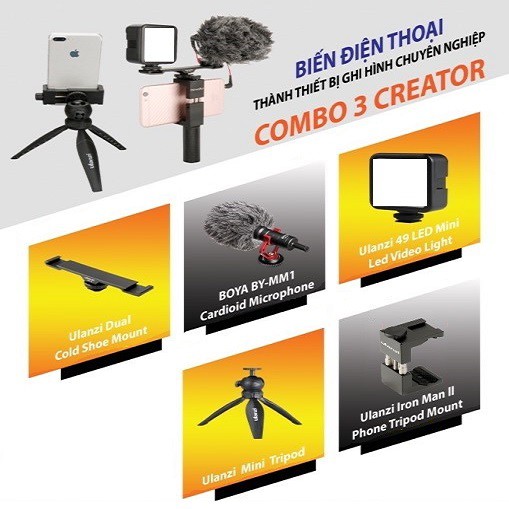 Bộ phụ kiện quay phim trên điện thoại bao gồm ngàm mở rộng Ulanzi PT2, micro Boya MM1, Đèn led VL49, Tripod, Ngàm điện thoại ST2.Bạn có thể phối hợp các phụ kiện theo mong muốn để đáp ứng nhu cầu quay phim trên điện thoại.