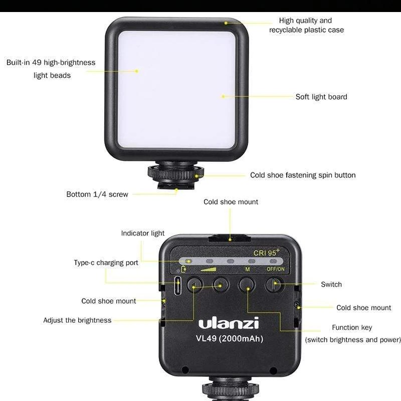 Ulanzi VL49 Mini LED là đèn Led cho máy ảnh, điện thoại, được thiết kế khá nhỏ gọn, có khả năng gắn kèm tối đa 03 thiết bị phụ kiện như mic thu âm, đèn led video hoặc monitor…..với 3 khe cắm phụ trên thân đèn.Hãng Ulanzi đã tích hợp 1 viên pin lithium 2000mAh, giúp bạn có thể sạc lại pin một cách nhanh chóng và tiện lợi. Ulanzi VL49 Mini LED sử dụng 49 đèn led siêu nhỏ, với ánh tạo ra ánh sáng mềm và liên tục, tránh hiện tượng bị nhấp nháy khi quay video.