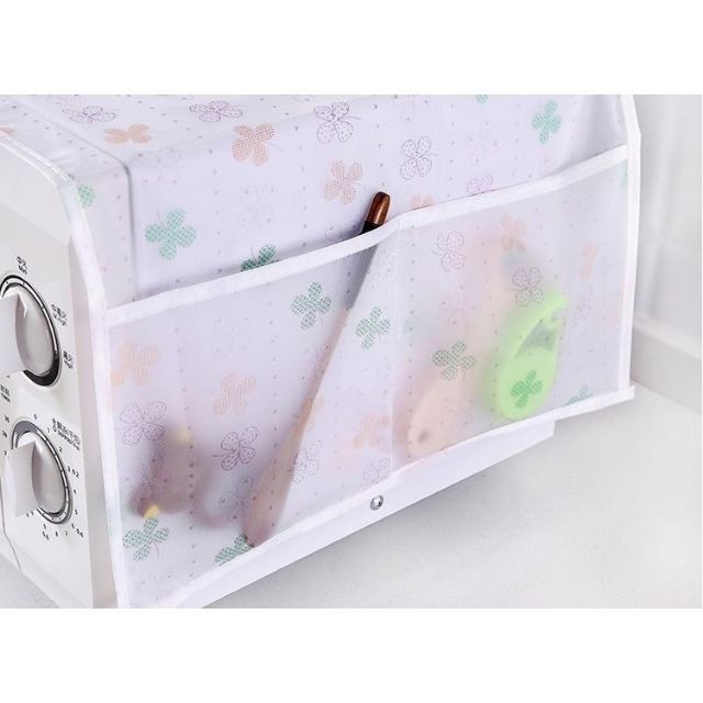 Tấm phủ lò vi sóng trong suốt có túi 2 bên tiện dụng . Giúp giữ bếp luôn sạch sẽ chống bám bẩn. Ngăn nhỏ 2 bên chứa được nhiều vật dụng giúp căn bếp thêm gọn gàng. Họa tiết nhẹ nhàng trang nhã.Chất liệu nhựa pvc mỏng, dai ít bám bẩn, dễ lau chùi giặt