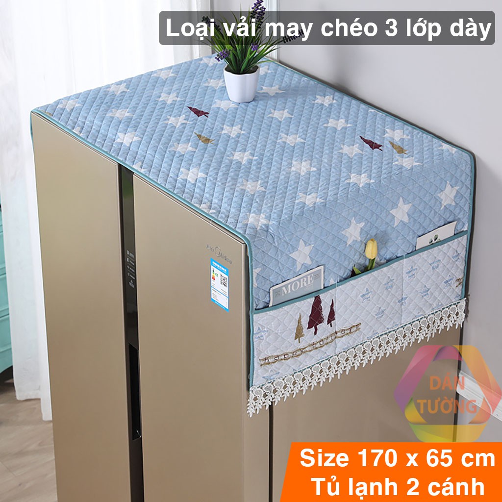 Tấm phủ tủ lạnh đôi 2 CÁNH lớn CAO CẤP MDT _PHC, khăn phủ che tủ lạnh vải may chéo 3 lớp dày, có túi size to 65 x 170cm