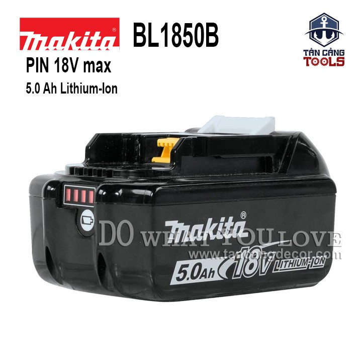 - Pin 18V 5.0Ah Makita BL1850B Lithium - Ion là dòng pin hiện đại có thời gian sử dụng lâu hơn và giảm thiểu tình trạng tự xả khi không sử dụng. Có đèn hiển thị dung lượng pin còn bao nhiêu, với 4 nấc, dễ dàng quan sát tránh ảnh hưởng đến tiến độ công việc. Pin BL1850B chỉ tương thích với bộ sạc Makita DC10WD và DC10SB.