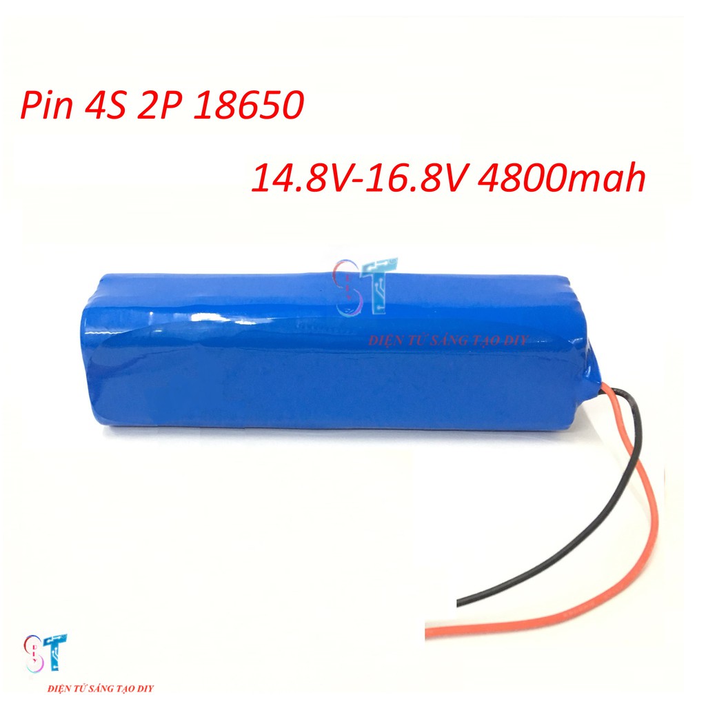 Pin Sạc Lithium 4S 2P 18650 14.8V-16.8V 4800mah được sản xuất từ pin 18650 đóng thành pack pin 4s 14.8V đã bao gồm mạch sạc và bảo vệ pin để bảo vệ pin trong quá trình sạc xả, với kích thước nhỏ gọn dễ sử dụng và mang theo sử dụng như 1 nguồn điện di độngSử dụng làm mạch pin của máy bắt vít, máy khoan, máy cưa và những thiết bị có công suất nhỏ có mức điện thế từ 14.4V – 16.8V