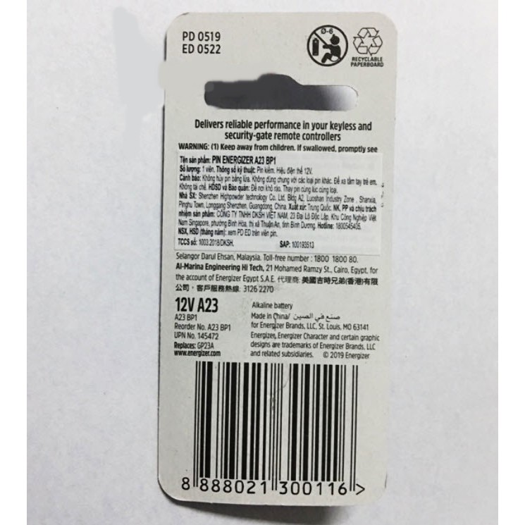 Pin A23 Energizer 12V là dòng pin chuyên dùng cho các thiết bị điều khiển remote cửa cuốn, chuông cửa nhà và 1 vài thiết bị điều khiển cần công suất cao và điện áp lớn. Là một trong những mã pin được sử dụng phổ biến trên thị trường hiện nay.- Với công nghệ sản xuất hiện đại,Chất liệu làm pin từ alkaline giúp pin lưu trữ điện ổn định trong thời gian dài mà pin không bị chảy nước, Pin có khả năng giữ điện lên đến 3 năm nên bạn không phải lo khi mua về mà chưa sử dụng đến.