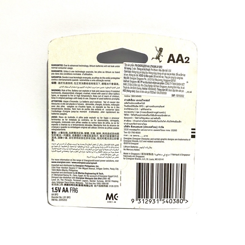 Thông tin sản phẩm: Pin AA Energizer Lithium L91 BP2Thông số kỹ thuật: Pin lithium. Hiệu điện thế 1.5V