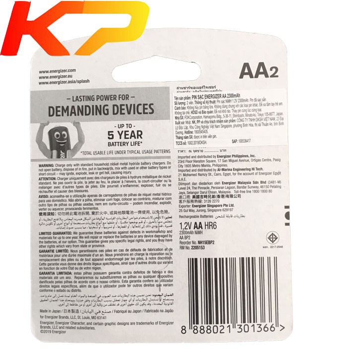 Pin sạc AA Energizer 2300mahHãng Energizer là thương hiệu nổi tiếng của Mỹ, là thương hiệu hàng đầu về pin sạc trên Thế giới, với các sản phẩm chất lượng cao và an toàn với người sử dụng và môi trường. Pin sạc AA của Energizer với dung lượng 2300mAh. Pin bền hơn gấp 6 lần so với pin sạc thường, pin sạc tiểu có thể giữ điện 1 năm sau khi sạc