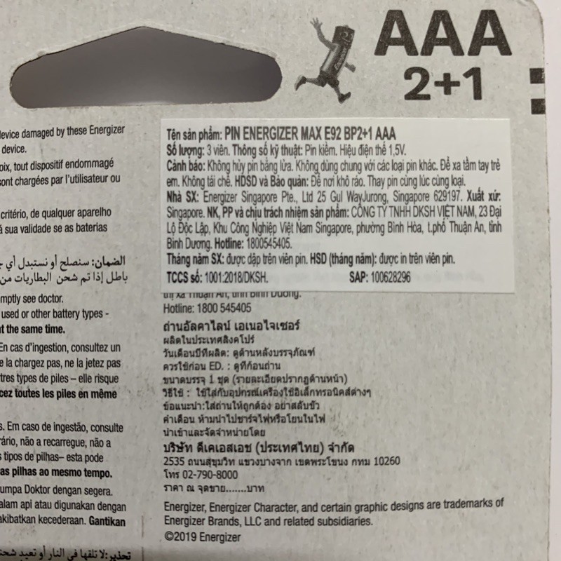 Tên sản phẩm: Pin Energizer Max E92 BP2 + 1 AAAXuất xứ: Singapore