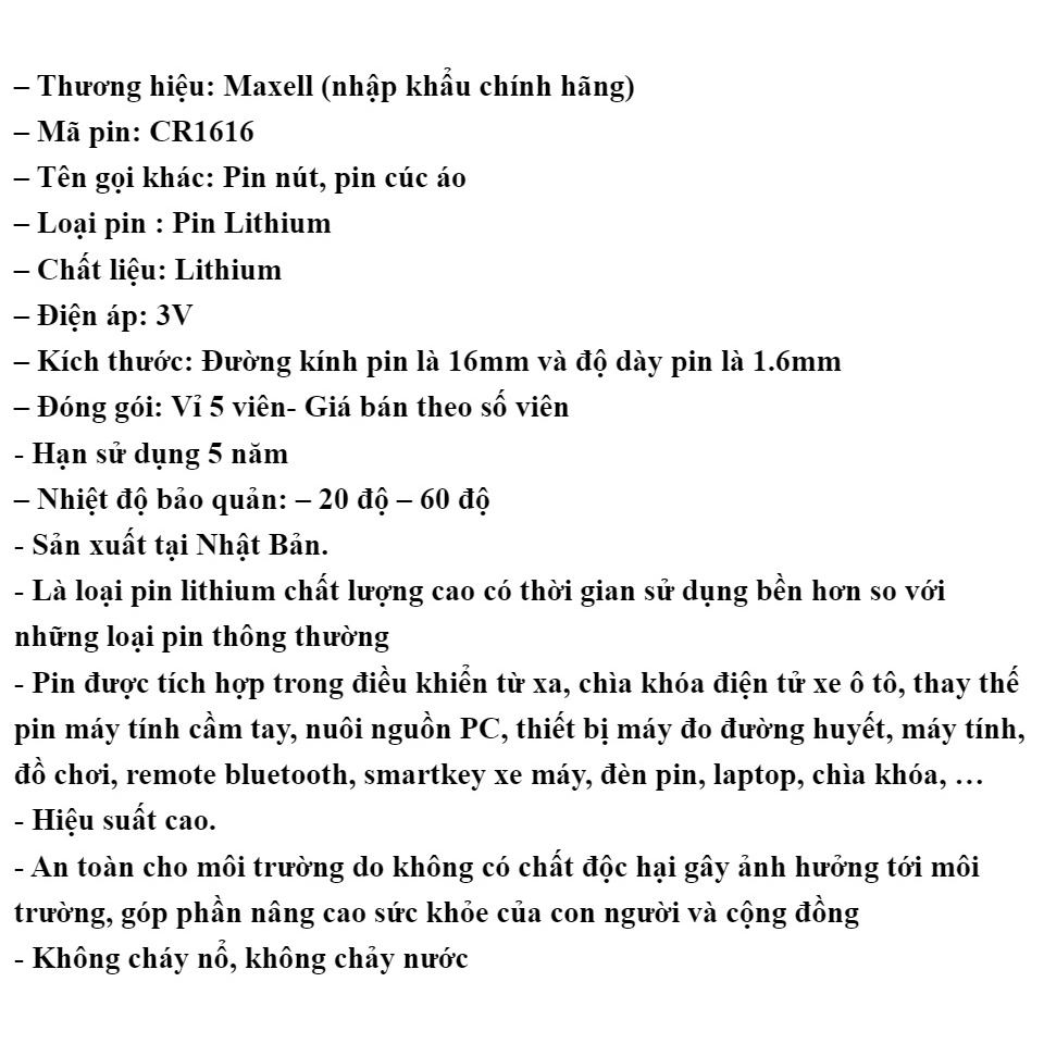– Thương hiệu: Maxell (nhập khẩu chính hãng)– Mã pin: CR1616