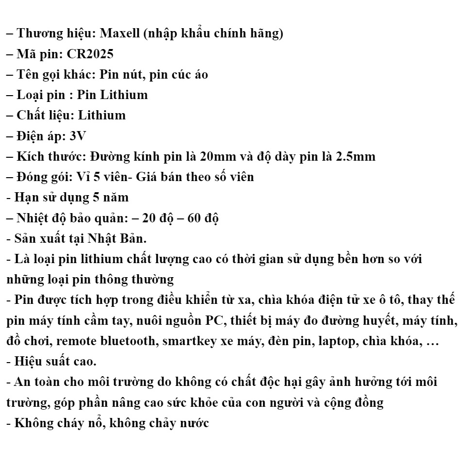 – Thương hiệu: Maxell (nhập khẩu chính hãng)– Mã pin: CR2025