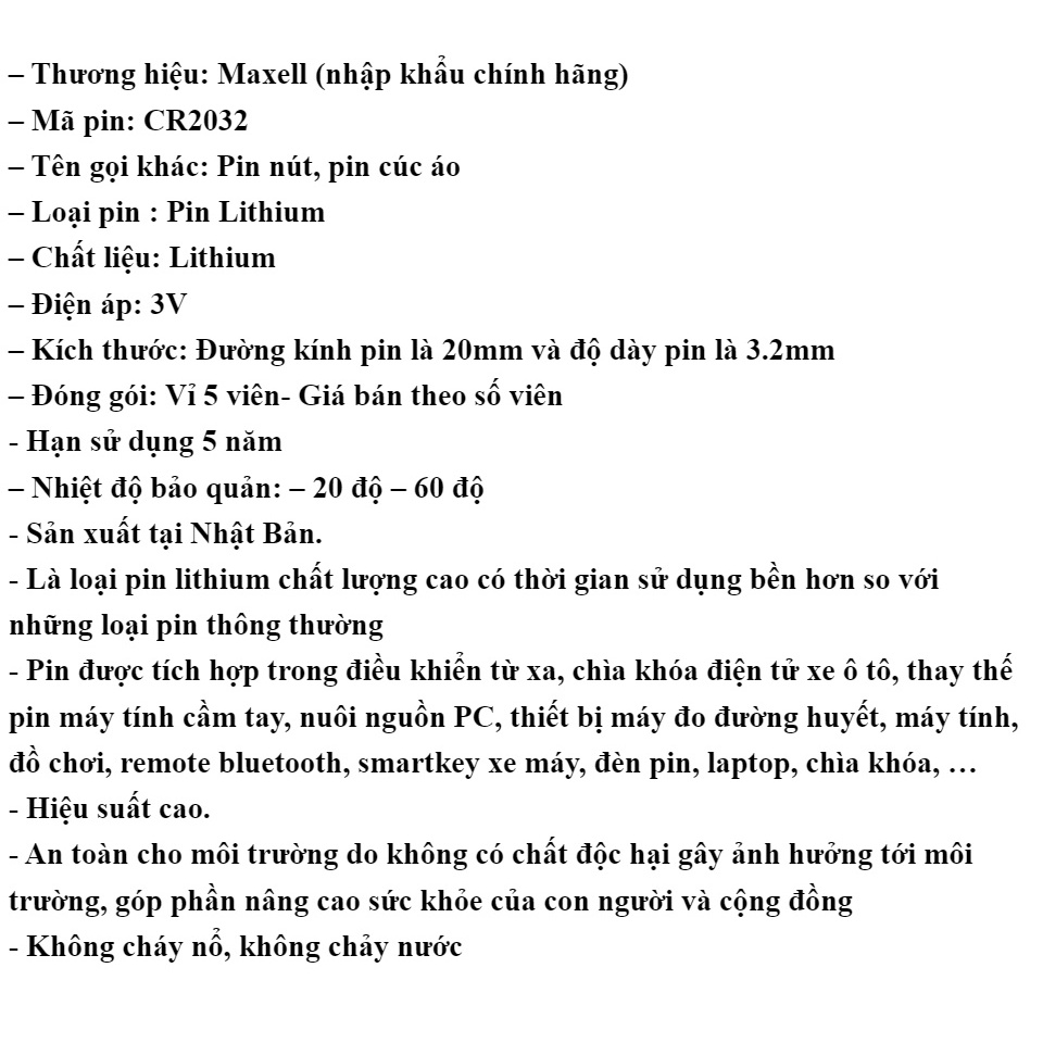 – Thương hiệu: Maxell– Mã pin: CR2032