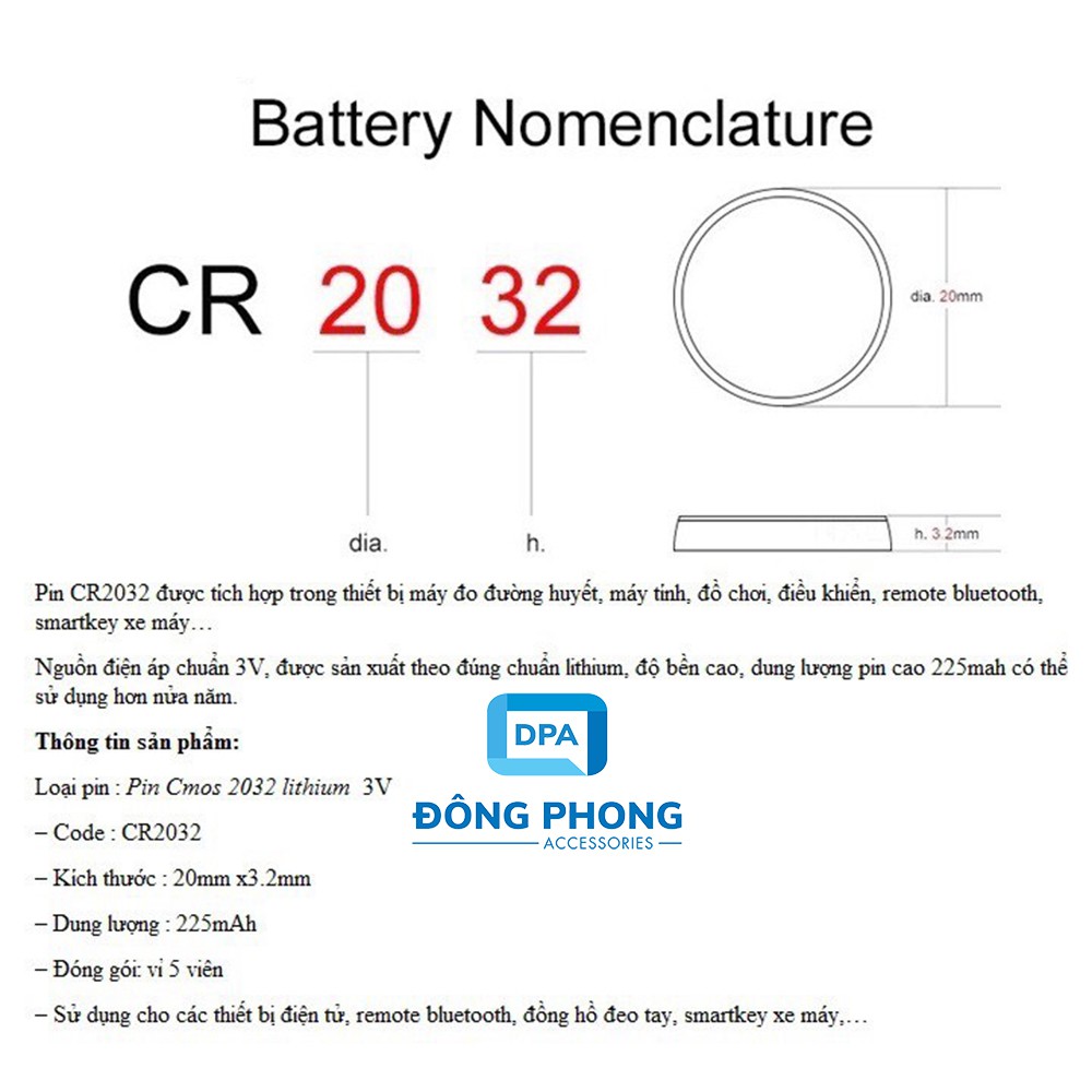 - Pin CR2032 là pin lithium 3V chất lượng cao an toàn cho thiết bị và tiết kiệm cho người dùng. Pin có thể lưu trữ lên tới 5 năm phù hợp với các thiết bị như máy đo huyết áp, đồng hồ, đồ chơi.