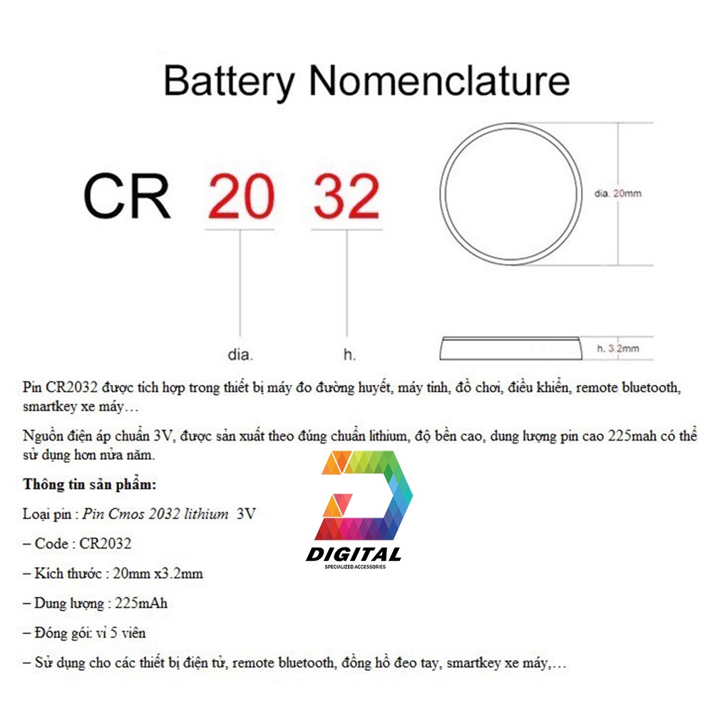 - Pin CR2032 là pin lithium 3V chất lượng cao an toàn cho thiết bị và tiết kiệm cho người dùng. Pin có thể lưu trữ lên tới 5 năm phù hợp với các thiết bị như máy đo huyết áp, đồng hồ, đồ chơi.