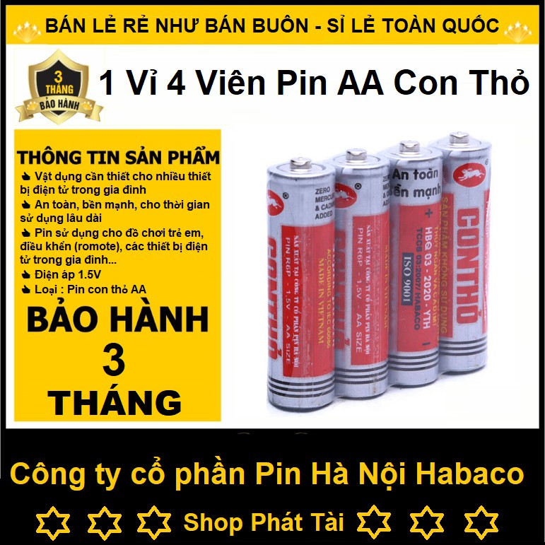 🏠🏠 Pin tiểu Con Thỏ Vỉ 4 viên là vật dụng cần thiết cho nhiều thiết bị như: điều khiển các thiết bị điện tử, đài bán dẫn và các thiết bị điện tử khác. Sản phẩm được sản xuất bởi Công ty cổ phần Pin Hà Nội (Habaco) theo công nghệ Carbon-zinc, đem đến độ bền cao và tuyệt đối an toàn cho sức khỏe người dùng. 🛒🛒📌📌 Thông tin sản phẩm 📌📌