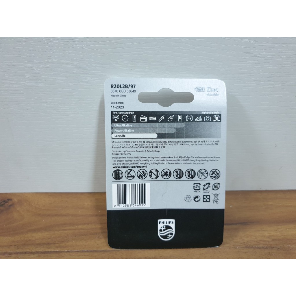 Pin D R20 MONO 1.5V Philips (R20L2B/97 Zinc chloride): Cặp 2 viênKích thước Pin: (Đường kính x Chiều cao): 34.2mm X 61,5mm