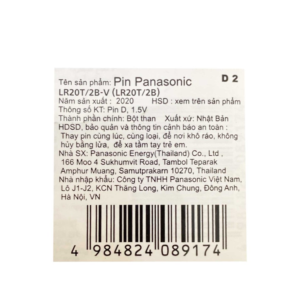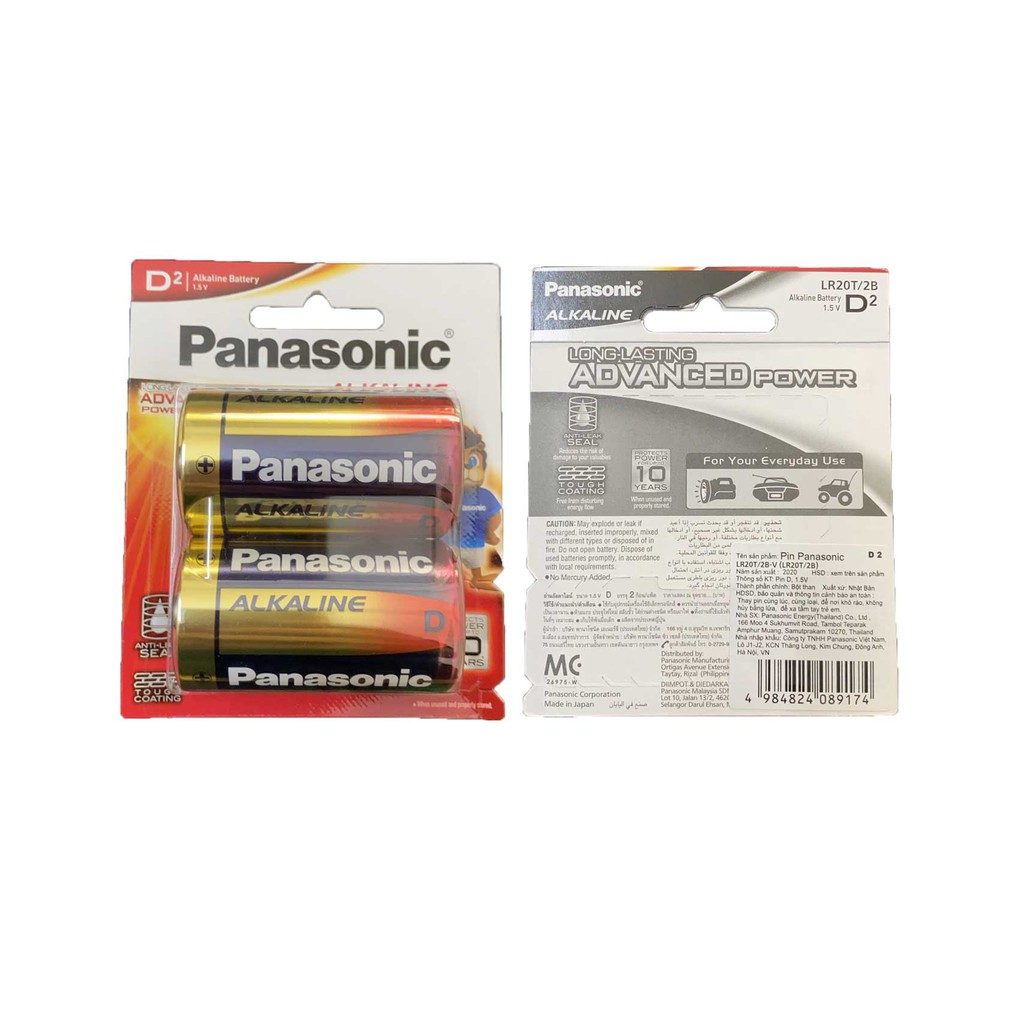 Pin Panasonic Đại (D) Alkaline LR20T/2B Là dòng pin chất lượng cao của hãng panasonic, pin được sản xuất tại Nhật Bản với chất lượng vượt trội, độ bền cao, dòng điện ổn định. Pin thường được sử dụng nhiều trong các bếp gas, đồng hồ cây, máy trợ xung trong thiết bị y tế, đèn pin, đài...Pin có hạn sử dụng lên đến 10 năm, năng lượng điện ổn định và gần như 100% không bị chảy nước khi sử dụng