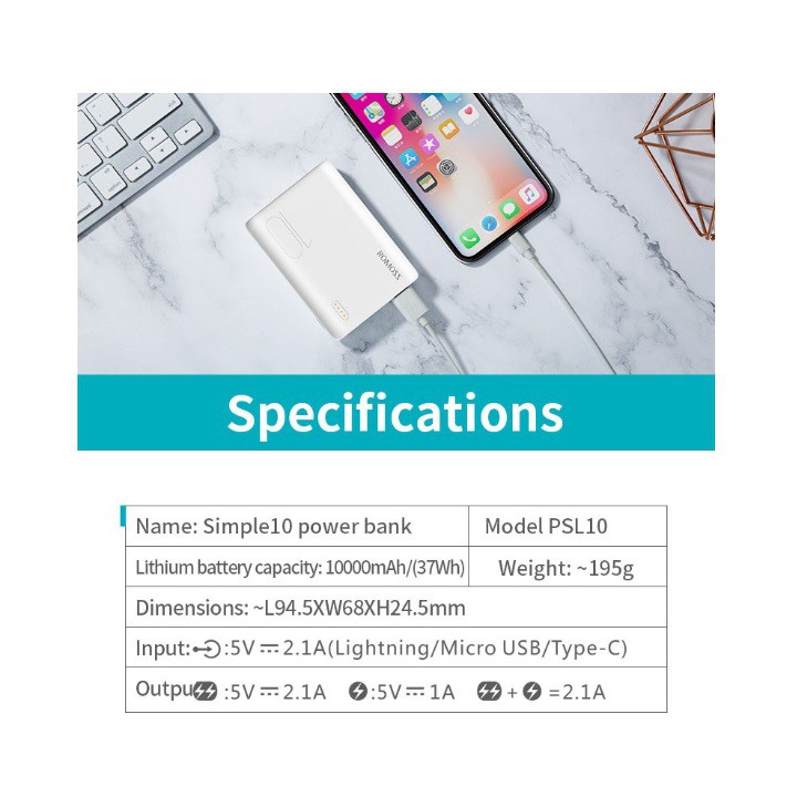 Với thiết kế đơn giản - gọn nhẹ nhưng Simple 10 lại có hiệu suất vượt trội. Cùng với dung lượng 10.000mAh giúp bạn sạc được thiết bị lâu hơn - bạn có thể sử dụng thoải mái và di chuyển dễ dàng hơn.