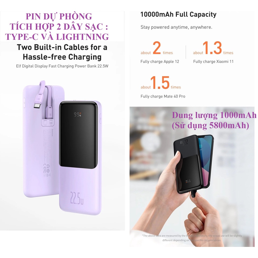 Pin dự phòng 10000mAh tích hợp sẵn 2 dây sạc( type-C và Lightning cho iPhone )hương thiệu Baseus, Name: Elf Digital Display Fast Charge Power Bank, Model: PPJL10-Dung lượng : 10000mAh , sử dung 5800mAh