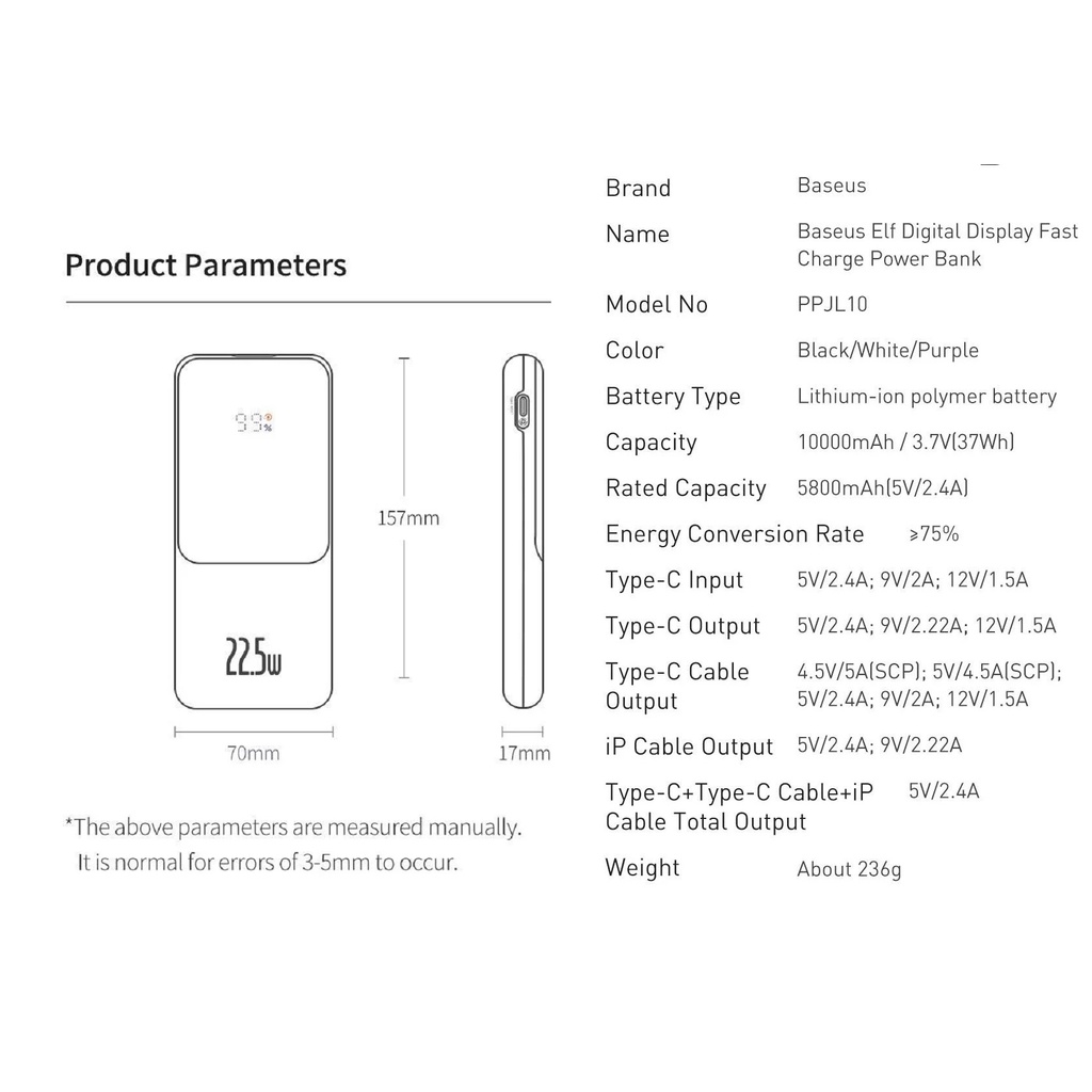 Giới thiệu Pin dự phòng 10000mAh 22.5W tích hợp dây sạc type-C và Lightning Baseus Elf Digital Display PPJL10