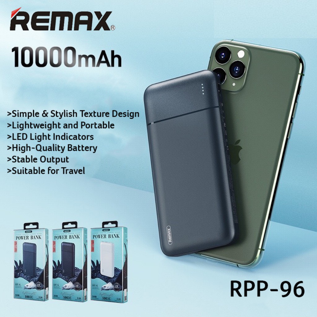 - Pin Dự Phòng 10000mah Remax RPP-96 Garie Series Fast Charing 2.1A tích hợp 2 cổng USB được trang bị lõi pin Lithium Polymer chất lượng cao với dung lượng 10000mAh cho phép sạc đầy thiết bị của bạn một cách rất tiện lợi