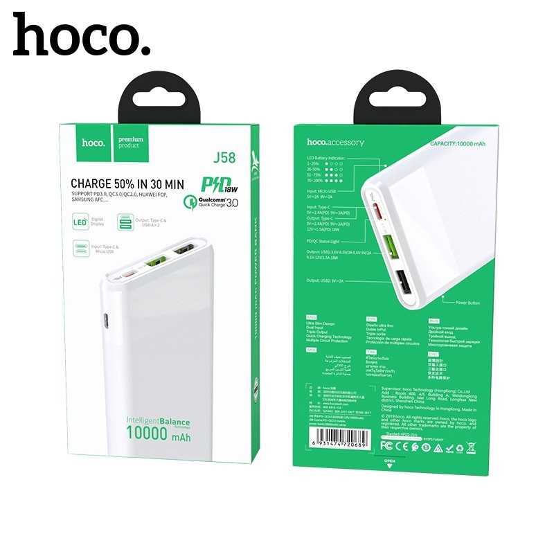 Pin dự phòng 2A/PD18W Hoco J58 dung lượng 10000mAh tích hợp đèn LED 3 cổng OutputBảo hành 12 tháng chính hãng, lỗi đổi mới (1 đổi 1)