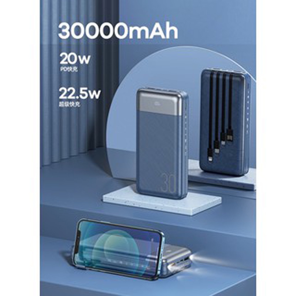 Pin sạc dự phòng 30000mAh Remax RPP-199 được trang bị 4 dây cáp đi kèm cùng 3 cổng ra với công suất tối đa 22.5W, cho phép sạc nhiều thiết bị cùng lúc.THÔNG SỐ KỸ THUẬT: