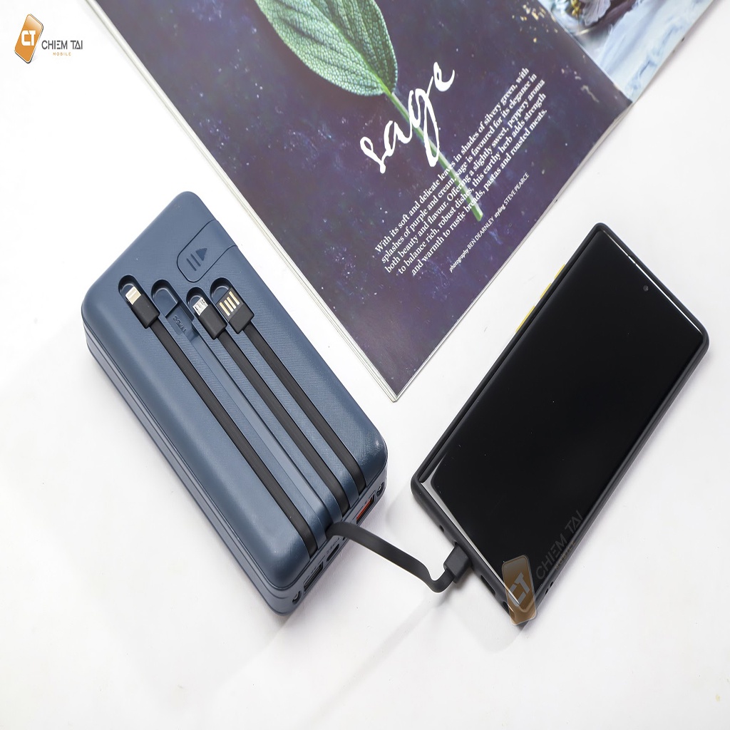 - Điều thú vị cục pin sạc dự phòng 30000mAh này tích hợp đến 4 dây cáp sạc đi kèm ở mặt sau của pin: