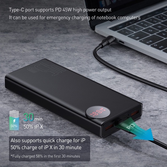 PIN SẠC DỰ PHÒNG BASEUS MULIGHT 20.000MAH/ 30000MAH - LED 18W/ 33W/ 65W SẠC NHANH Q.C 3.0 VÀ PD 3.0 CHÍNH HÃNGPIN SẠC DỰ PHÒNG BASEUS MULIGHT 20.000MAH LED 45W SẠC NHANH Q.C 3.0 VÀ PD 3.0 CHÍNH HÃNG hỗ trợ hầu hết các chuẩn sạc nhanh hiện nay (PPS/ PD/QC3.0...), tương thích với hầu hết các thiết bị số hiện nay từ Macbook/ Laptop cho đến Smartphone/ Tablet ...