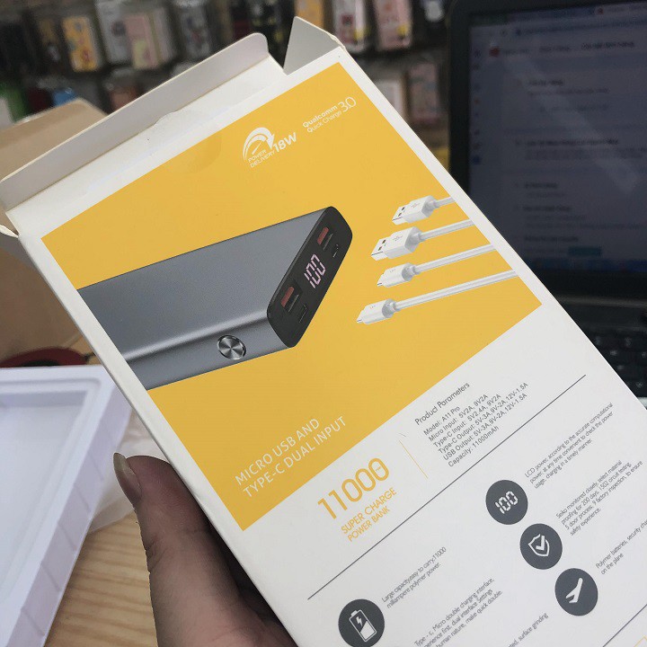 A11 Pro - Pin dự phòng tích hợp công nghệ sạc nhanh PD18W & Quick charge 3.0 giúp giảm thời gian sạc pin cho điện thoại.Lõi nhôm nguyên khối giúp pin luôn mát trong quá trình sử dụng, tăng tuổi thọ pin, phòng cháy nổ.