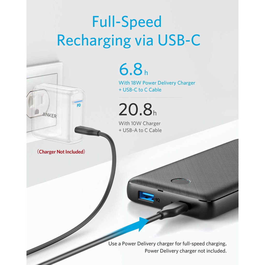 Cổng phân phối nguồn USB-C hỗ trợ cả đầu vào và đầu ra, do đó bạn có thể cấp nguồn cho thiết bị của mình và sạc lại PowerCore ở tốc độ cao - tất cả chỉ với một cáp. Cùng với cổng USB 18I PowerIQ 2.0, giờ đây bạn có thể sạc hầu như mọi điện thoại hoặc máy tính bảng ở tốc độ cao. (Tương thích với sạc nhanh Qualcomm)