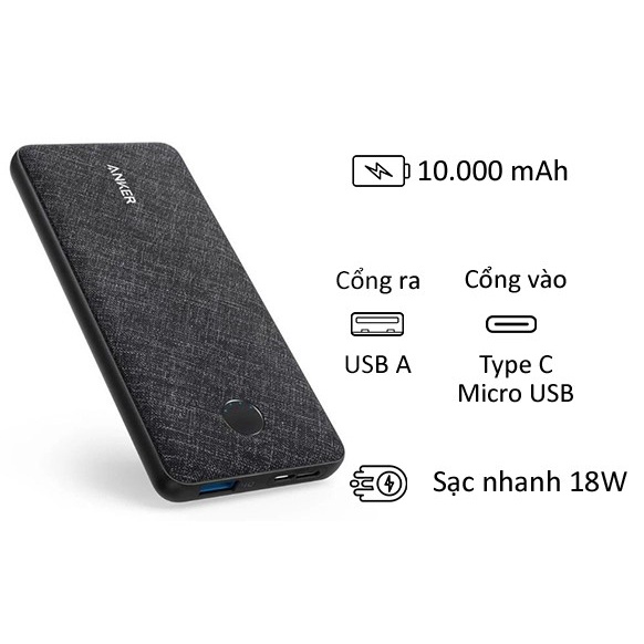Pin dự phòng Anker Powercore Slim 10000mAh A1229 bọc vải - CỤC SẠC DỰ PHÒNG GỌN NHẸ AN TOÀN KHÔNG NÓNG MÁY