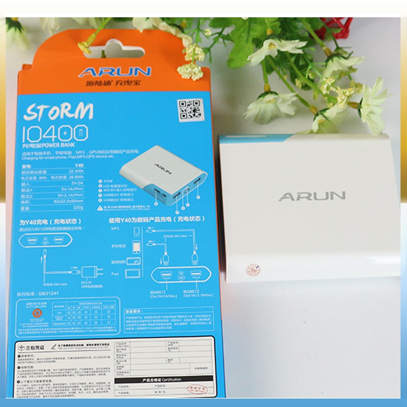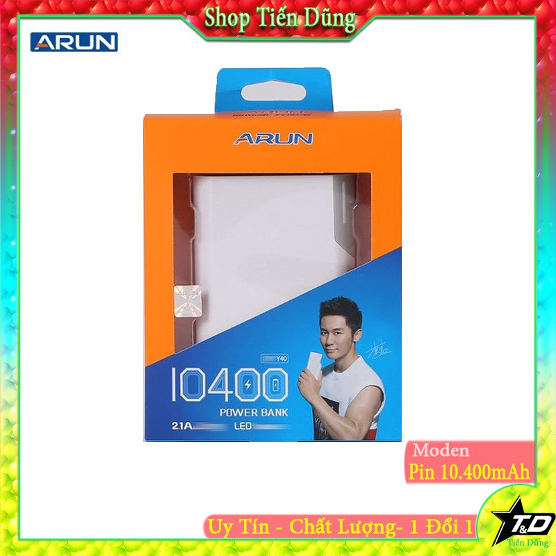 - Pin sạc dự phòng Arun 10400mAh được sở hữu thiết kế hiện đại, nhỏ nhắn và tương đối gọn nhẹ với 4 viên pin Lithium – Ion cao cấp. Sản phẩm có dung lượng lưu trữ lên đến 10400mAh giúp người dùng có thể thỏa sức trải nghiệm các thao tác như lướt web, xem phim, chơi game,… trên các sản phẩm Smartphone, Tablet của mình mà không lo máy sẽ bị hết pin.