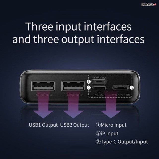 ✅ Ngỏ vào : được trang bị 3 cổng sạc ngỏ vào gồm Lightning, Micro và Type C . Trong đó cổng Type C hỗ trợ sạc nhanh đồng thời cả in và out (Bi-directional quick charging). Việc trang bị cả 3 cổng sạc ngỏ vào cho phép bạn bạn có thể sạc cho pin bằng chính cáp của điện thoại mà không cần trang bị thêm cáp sạc riêng.