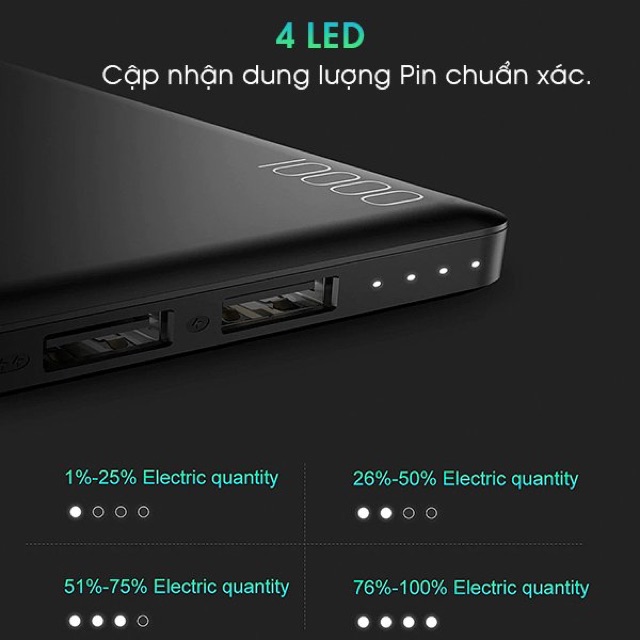 Cổng Input đơn, Output kép. 10000mAh sạc Pin với cổng Outputs kép cho phép sạc 2 thiết bị cùng lúc. Nhanh hơn, tiết kiệm hơn.