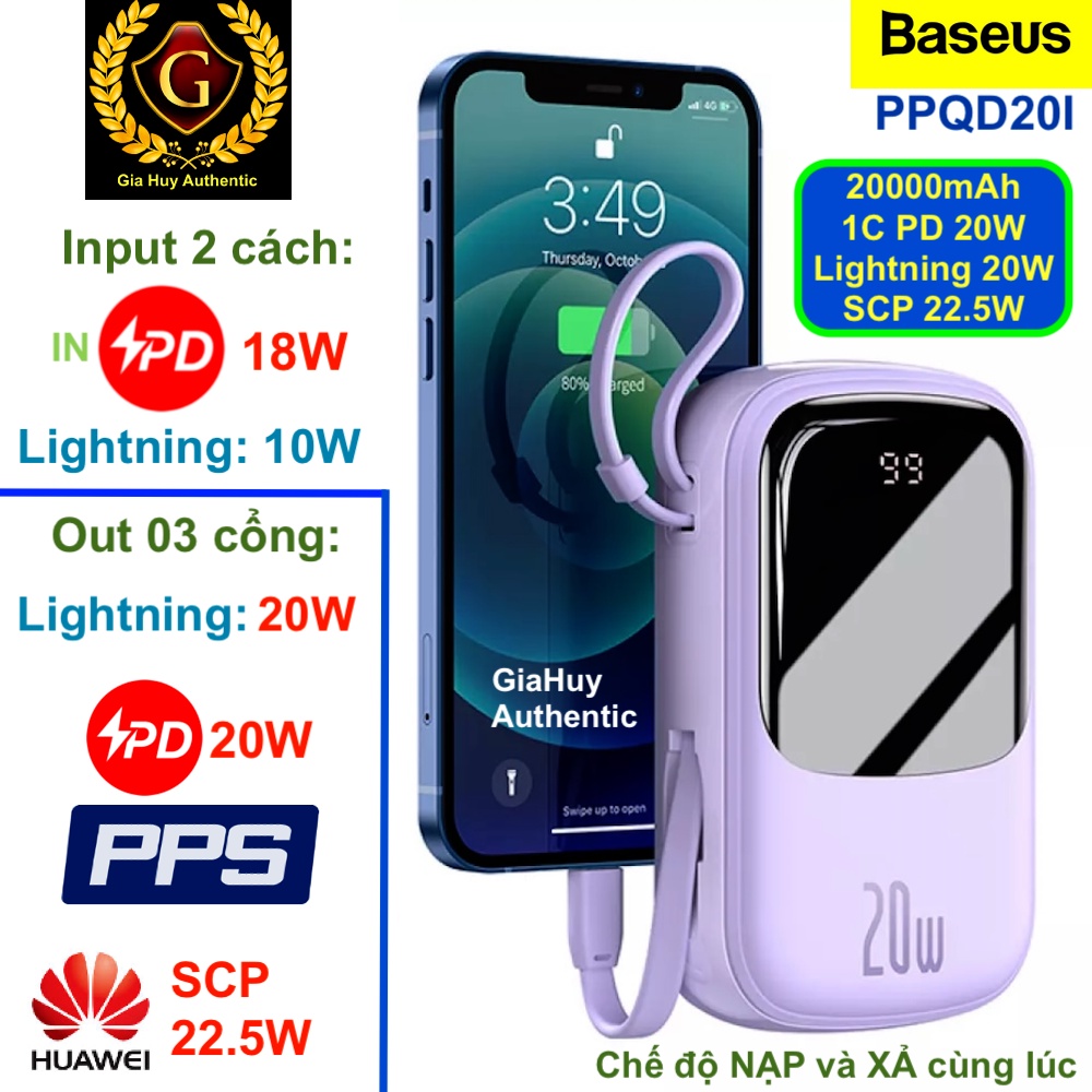 Điện Thoại & Phụ Kiện > Phụ kiện > Sạc dự phòng & Pin > Sạc dự phòng || Pin dự phòng BASEUS PPQD20I QPOW Digital Display 20000mAh tích hợp cáp Lightning PD 20W, 1C PD/ PPS 20W & 1A SCP 22.5WCòn hàng