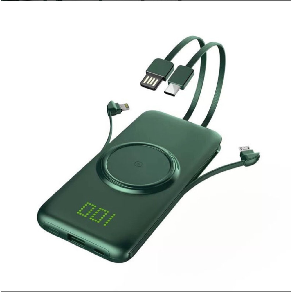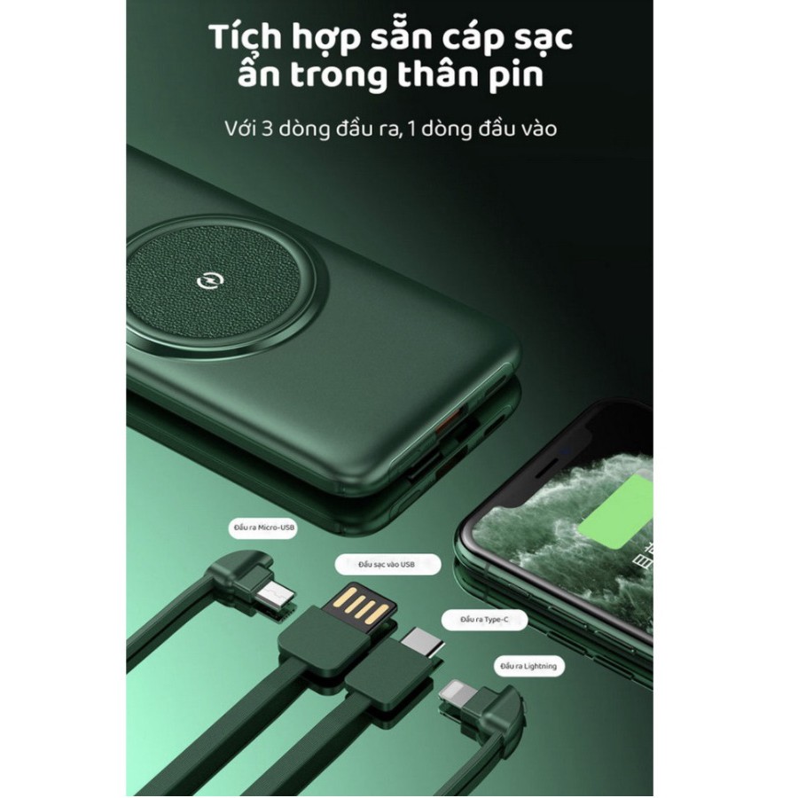 - Tích hợp 3 cáp sạc ra (Micro-USB, Type-C, Lightning) và 1 cáp sạc USB vào và 1 cổng sạc ra, 1 cổng sạc vào bằng cáp sạc ngoài