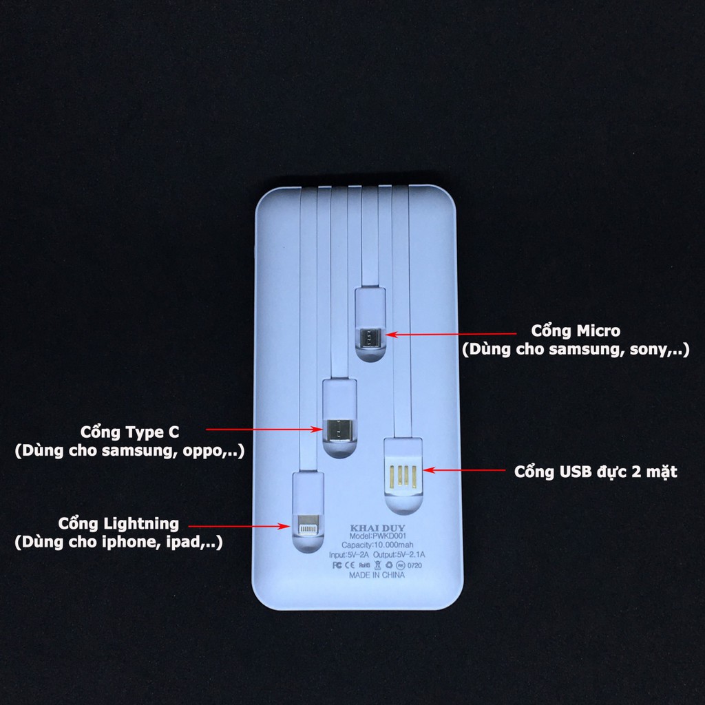 Được mệnh danh là một trong 3 loại Pin Sạc Dự Phòng Cao Cấp và bền bỉ nhất hiện nay, Pin Sạc Dự Phòng Mini Chính Hãng Khai Duy 20000mah 4 cáp sạc siêu bền bỉ, bảo hành lên tới 12 tháng (đối với khách tiêu dùng) và 24 tháng (đối với đại lý). Sản phẩm được săn đón nhất tháng 8 bởi công nghệ cao cấp IC giúp bảo vệ tuổi thọ Pin Điện Thoại, Pin Laptop. Tốc độ sạc nhanh đầy pin (DC 5V-2A) đỉnh cao nổi bật so với những sản phẩm cùng loại.Pin Sạc Dự Phòng Cao Cấp