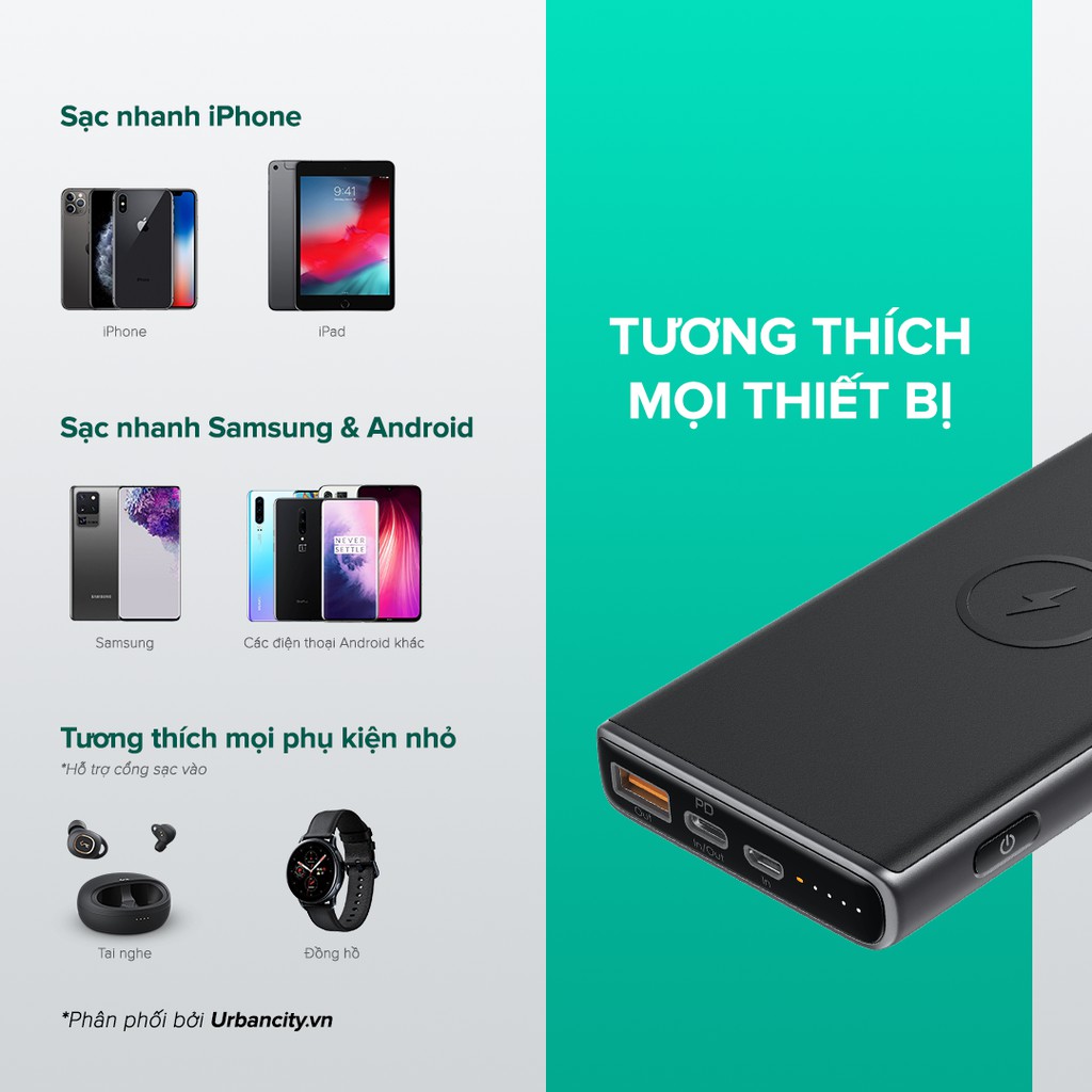 SẠC DỰ PHÒNG 10.000 MAH AUKEY PB-Y32Power Delivery + QC 18W + Sạc không dây chuẩn Qi 10W