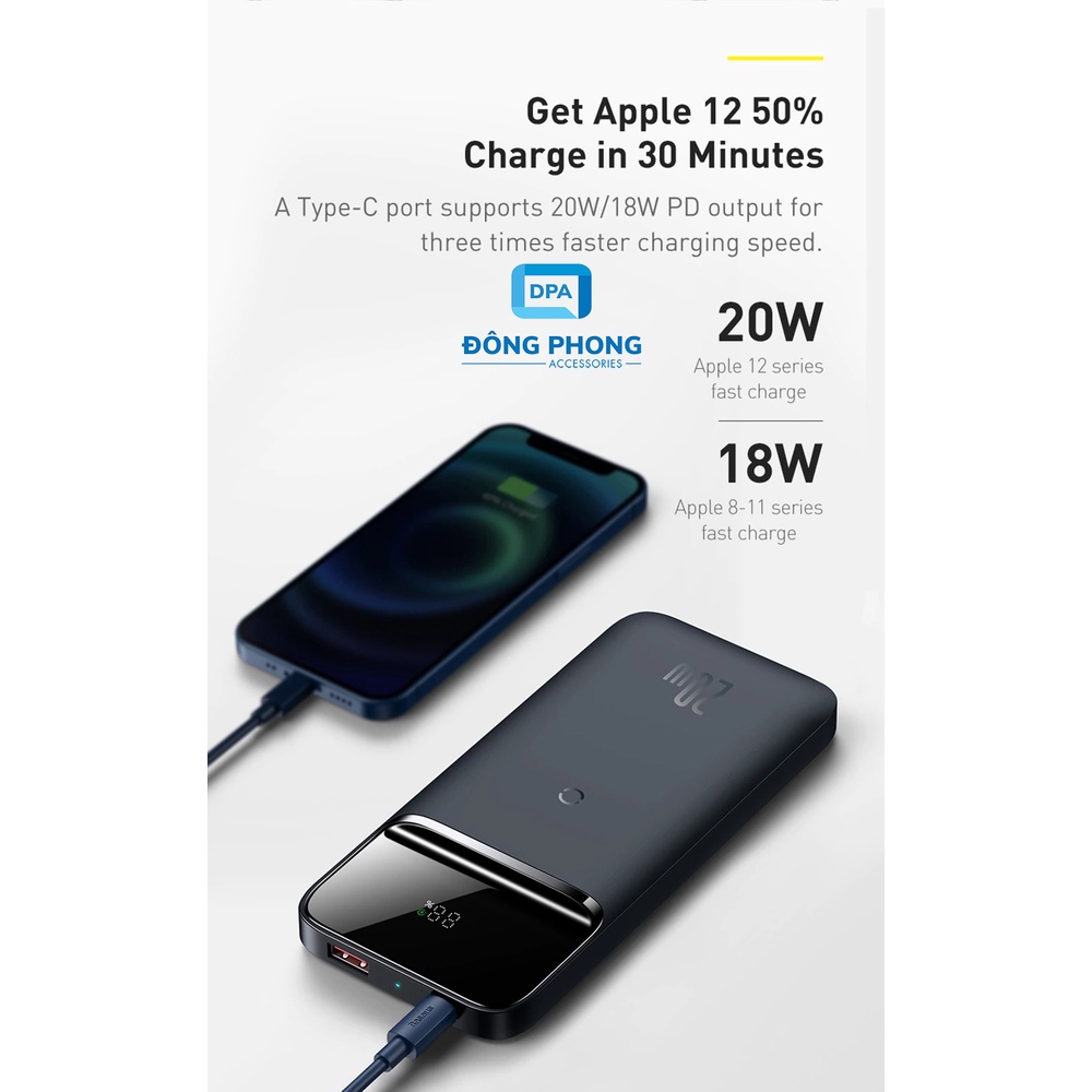 - Pin dự phòng Baseus tại ĐÔNG PHONG ACCESSORIES có thiết kế nhỏ gọn kiểu dáng sang trọng bắt mắt và hiện đại dung lượng 10.000mAh với công suất sạc bằng dây là 20W và sạc không dây là 15W.