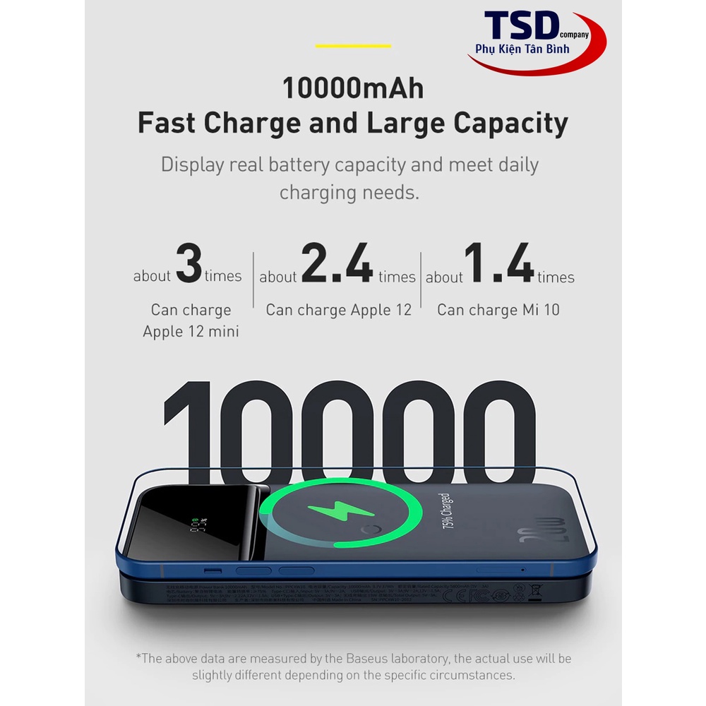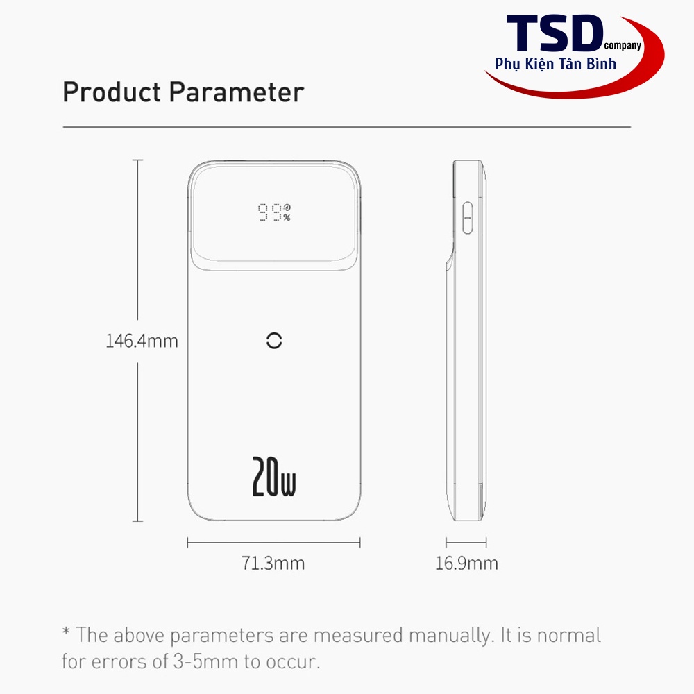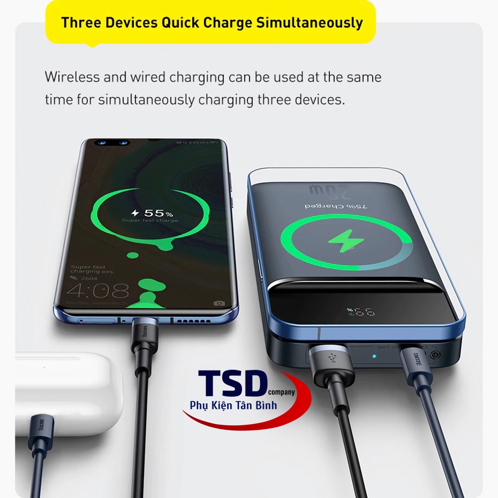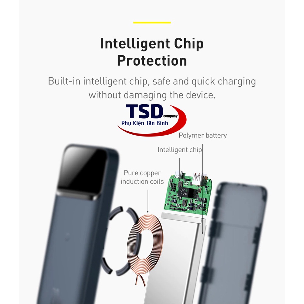- Pin dự phòng Baseus tại Phụ Kiện Tân Bình có thiết kế nhỏ gọn kiểu dáng sang trọng bắt mắt và hiện đại dung lượng 10.000mAh với công suất sạc bằng dây là 20W và sạc không dây là 15W.