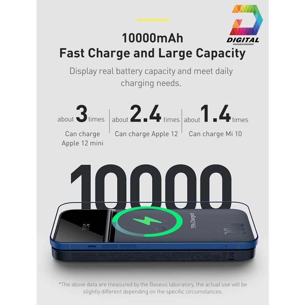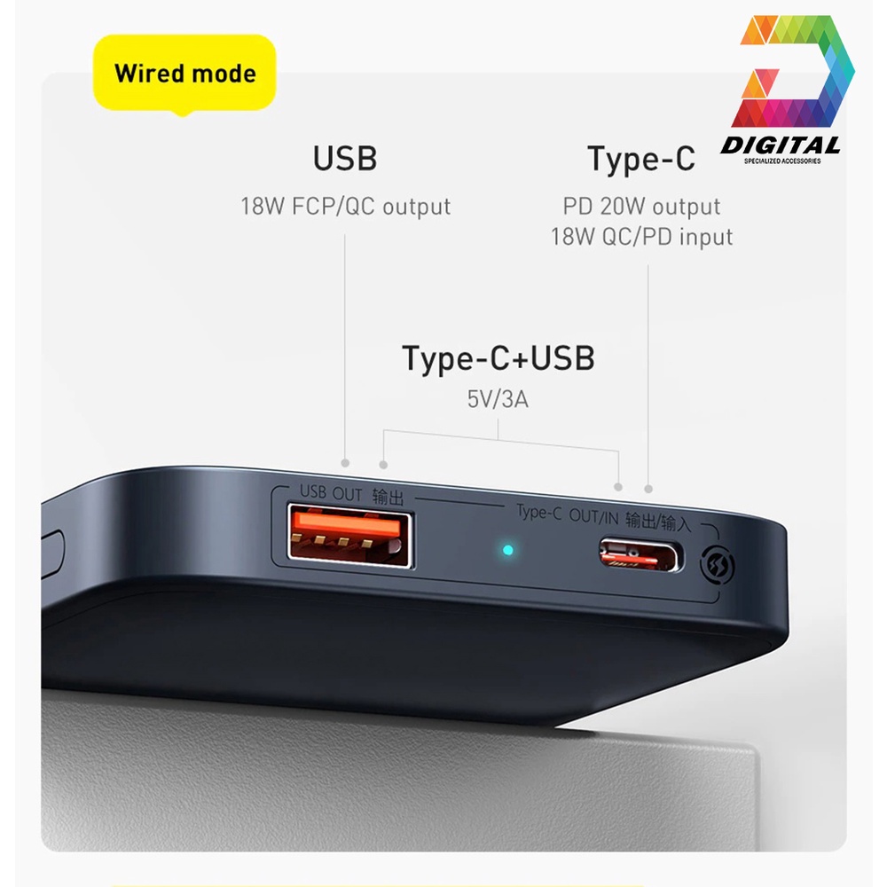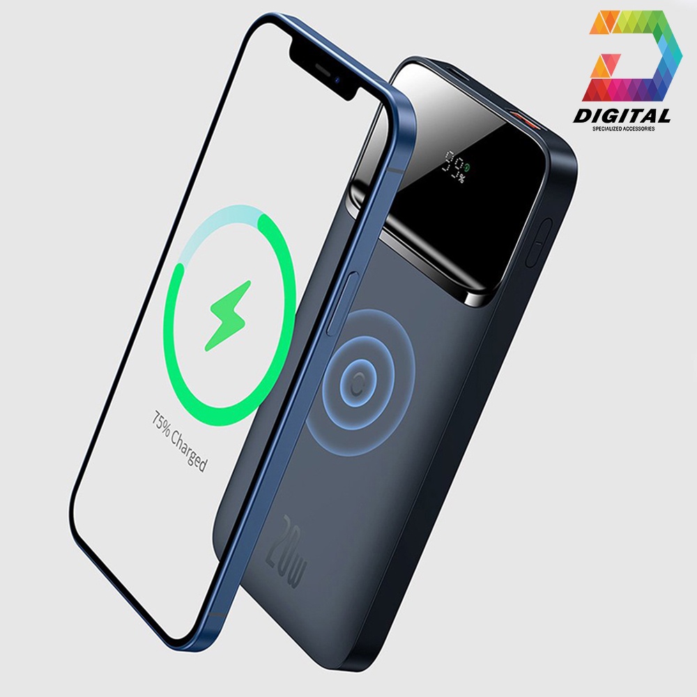 - Là dòng pin dự phòng hỗ trợ sạc không dây cao cấp đến từ Baseus . Với thiết kế nhỏ gọn, kiểu dáng sang trọng bắt mắt và hiện đại, sản phẩm có 2 cổng sạc phổ thông là USB và Type C có hỗ trợ sạc nhanh PD/QC với công suất sử dụng lên đến 20W . Ngoài ra pin dự phòng Baseus Magnetic Wireless Quick Charging còn được trang bị nam châm theo chuẩn magsafe của Apple thiết kế này cho phép pin có thể hút chặc vào mặt lưng của iPhone 12 & 13 Series giúp tăng cường hiệu quả và tính tiện dụng khi sạc không dây cho iPhone . Sản phẩm tương thích với hầu hết các smartphone hiện nay như iPhone/Samsung / OPPO / Xiaomi....