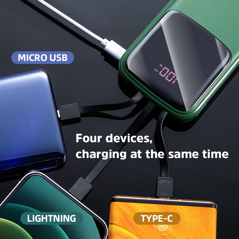 +10000mAh Đi kèm với bốn cáp sạc, bốn cổng có thể được sạc bạn dễ dàng nạp năng lượng tức thời cho điện thoại, máy tính bảng hoặc có thể chia sẻ 1 cổng sạc cho người xung quanh.