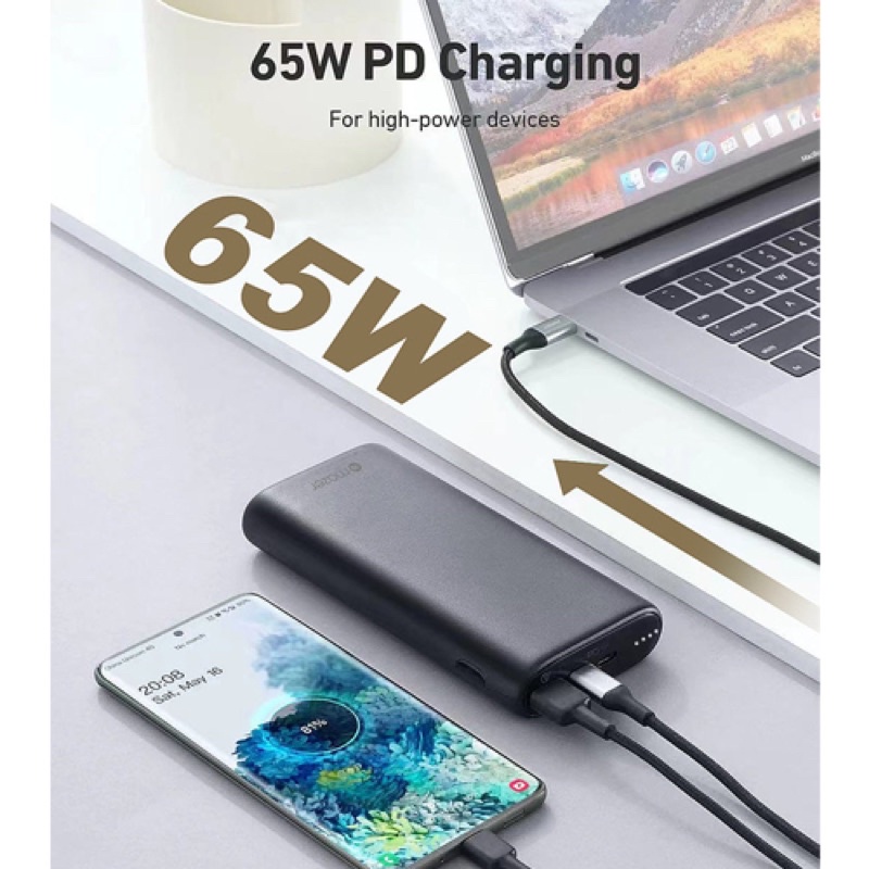 Dung lượng 20.000mAh đủ để sạc điện thoại thông minh nhiều lầnCông suất 65W để sạc nhanh điện thoại, Macbook Pro 13", iPad và hỗ trợ sạc được cho Laptop