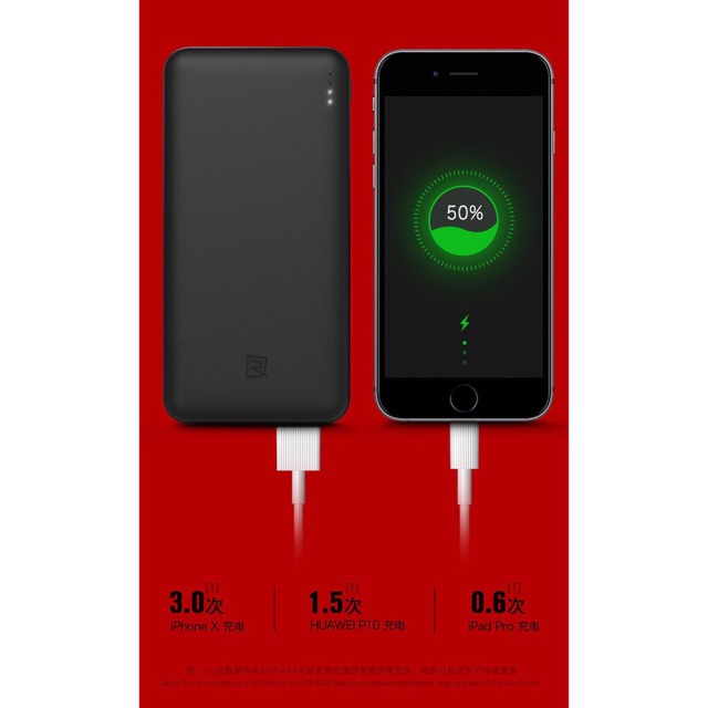 Hơn nữa, pin sạc dự phòng RPP-119 còn hỗ trợ sạc nhanh với nguồn ra 2.1A có thể sạc 2.0 lần cho iPhone 8, 1.5 lần cho Huawei P10 và 0.6 lần cho iPad Pro.