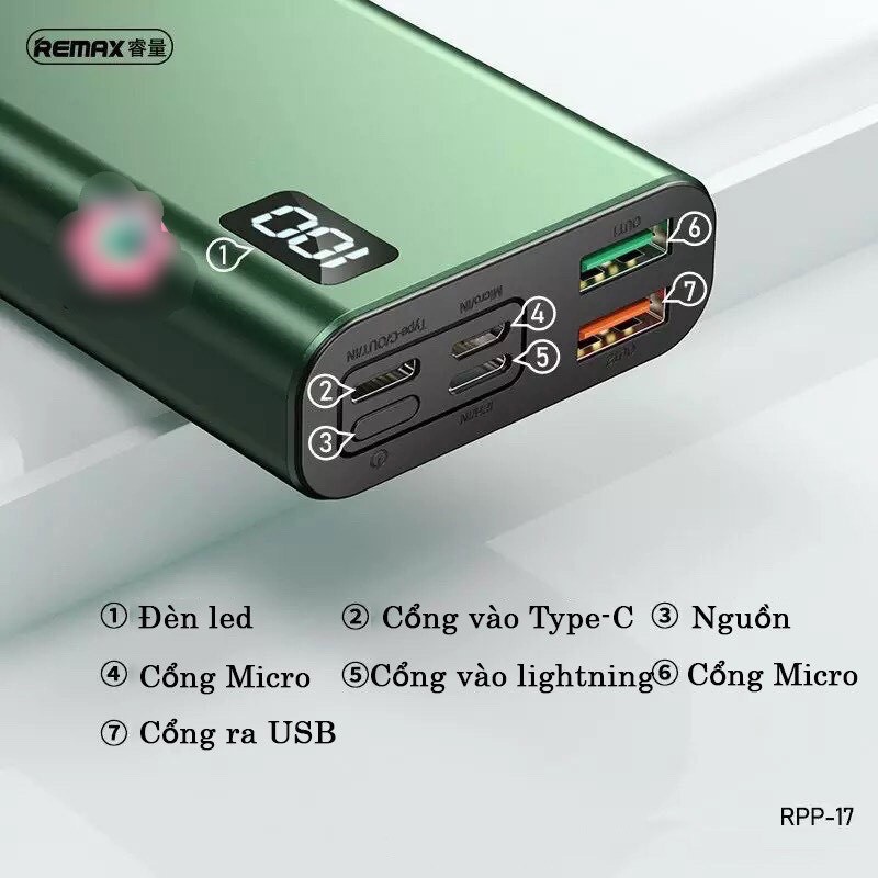 Pin dự phòng remax RPP-17 dung lượng 15.000mAh có đèn led báo pin sạc hỗ trợ 3 cổng vào lightning micro và type-C