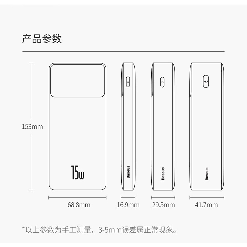 Thiết bị có màn hình LED lớn, sáng bóng ở phần trên, tạo ra độ tương phản khiêm tốn nhưng đáng kể cho tổng thể mờ. Baseus Powerbank được làm bằng vật liệu ABS và Polycarbonate chất lượng cao.